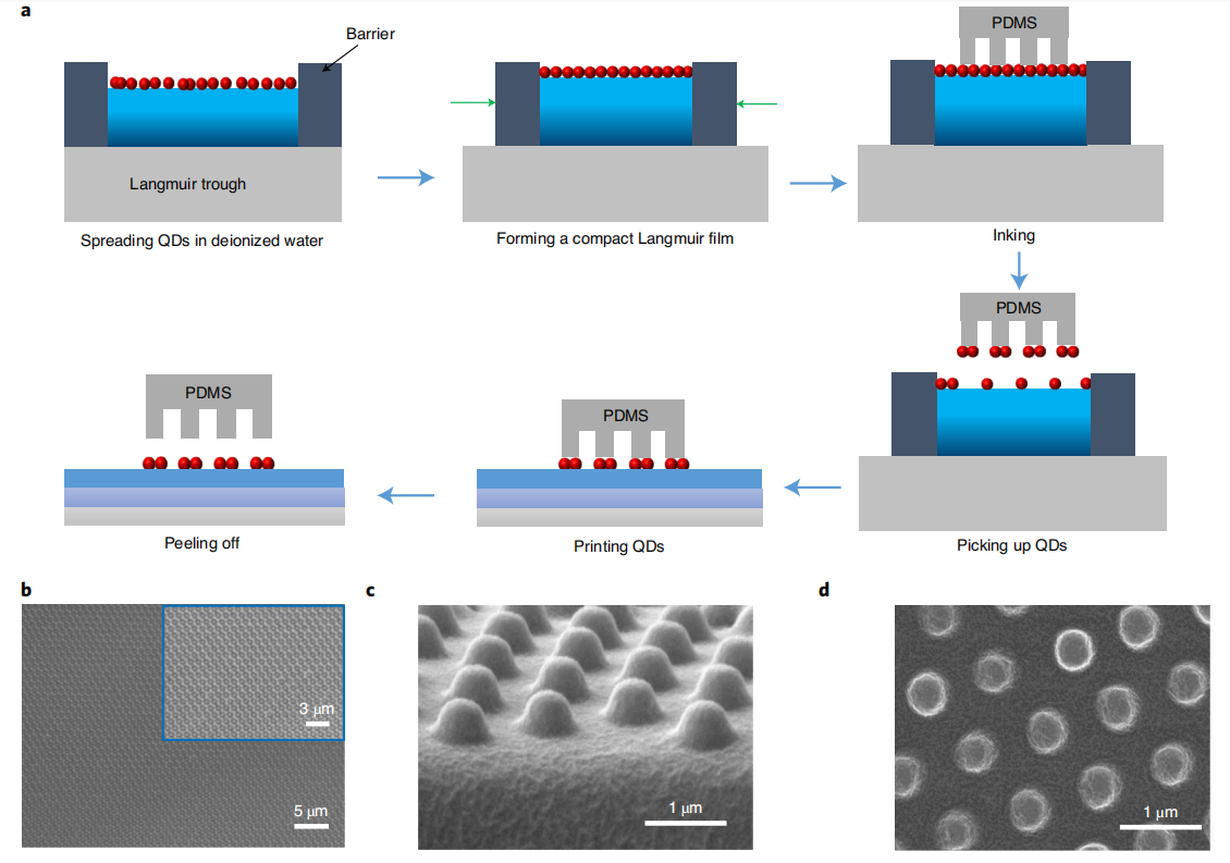 (a)LB-TP工艺示意图;(b)微结构PDMS印章的光学显微镜图像;(c-d)微结构PDMS印章的扫描电子显微镜图像(直径,间距和高度均为500 nm)。福州大学供图